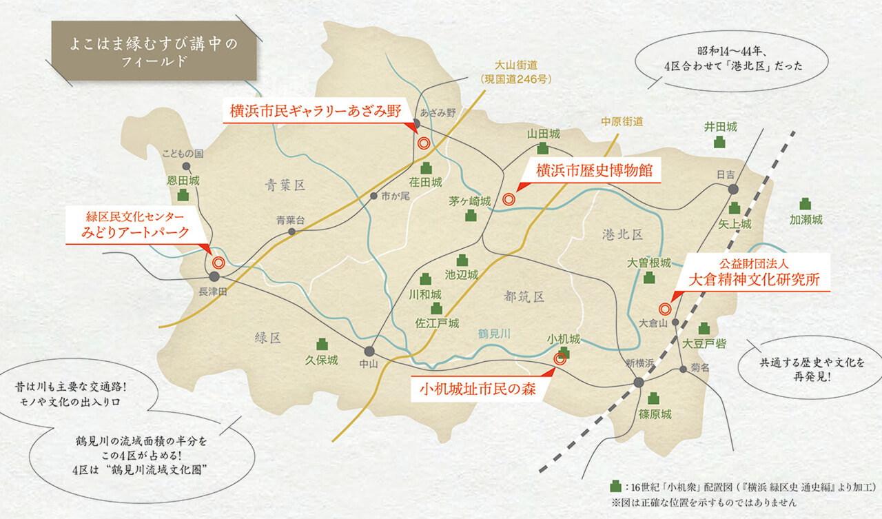 遡ること戦国時代、小田原北条氏が直接治めた港北区の小机城を中心に、この4区にあたるエリアを含む鶴見川流域沿いには城が数多く構えられていました。小机城の城代・笠原氏は「小机衆」と呼ばれる軍団をつくり、横浜北部から川崎市域に10以上の出城を置き、治めていたのです。